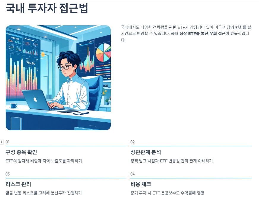 국내에서도 다양한 전략광물 관련 ETF가 상장되어 있어 미국 시장의 변화를 실시간으로 반영할 수 있습니다. 해외 주식 직접투자가 부담스러운 투자자라면, 국내 상장 ETF를 통한 우회 접근이 효율적입니다. 다음은 투자 시 유용한 팁들입니다.