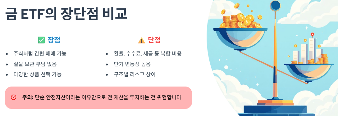 금 ETF의 가장 큰 매력은 주식처럼 간편하게 거래할 수 있다는 점이에요. 하지만 동시에 몇 가지 단점도 존재합니다. 저 역시 처음엔 무작정 ‘안전하다’는 이유로 끌렸는데, 따져보니 장점만큼 단점도 뚜렷하더군요.