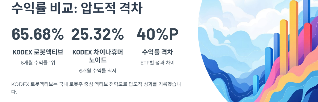 최근 가장 높은 수익률을 기록한 ETF는 단연 ‘KODEX 로봇액티브’였어요. 6개월 수익률이 무려 65.68%로, 같은 기간 최저 수익률을 기록한 ‘KODEX 차이나휴머노이드로봇’(25.32%)과 비교하면 40%포인트 넘게 차이가 나요. 아래 표로 정리해봤어요.